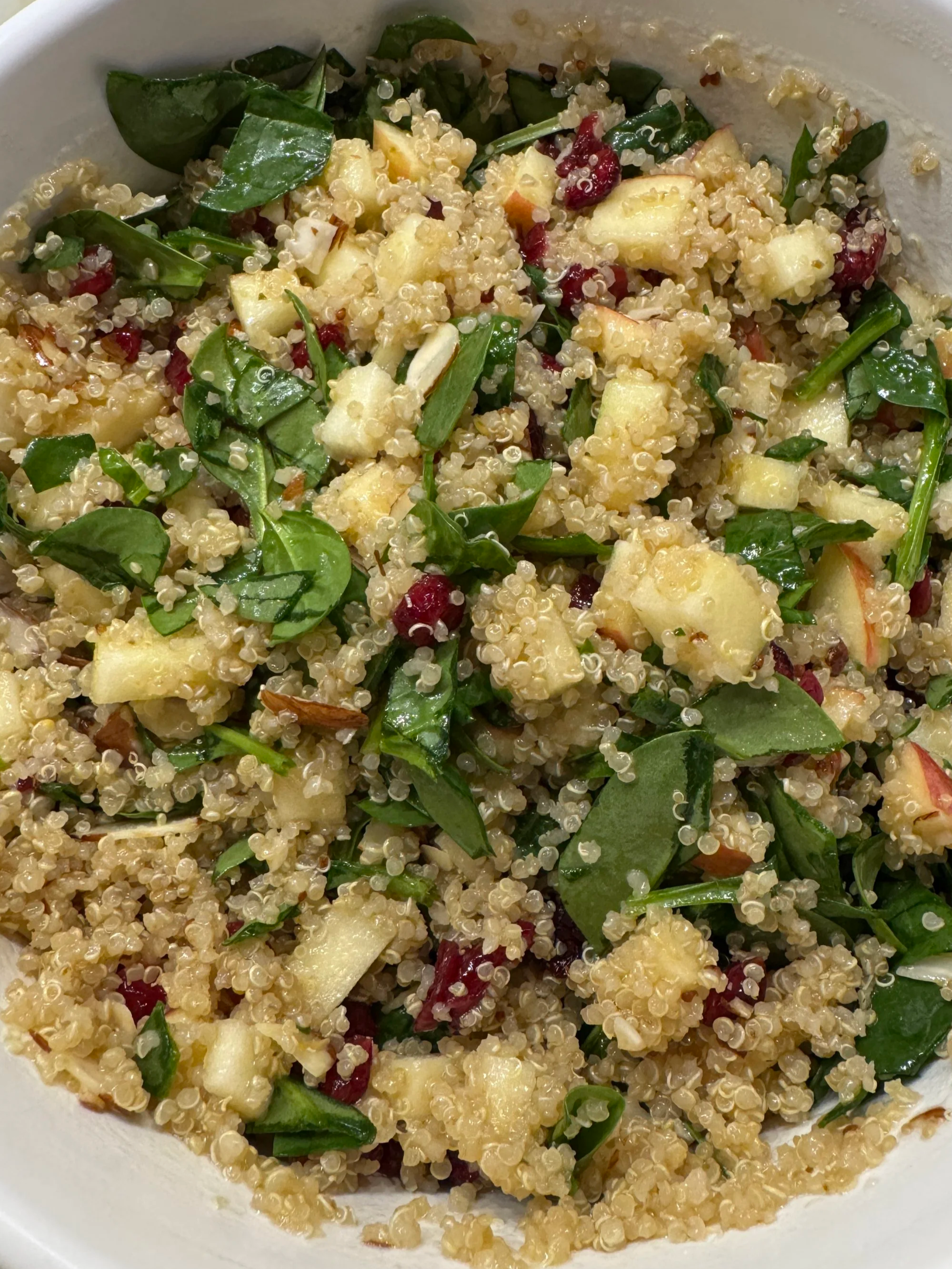 While the quinoa is cooling, make the dressing. In a small bowl or jar, stir or shake all the dressing ingredients together. Season with salt, to taste.
