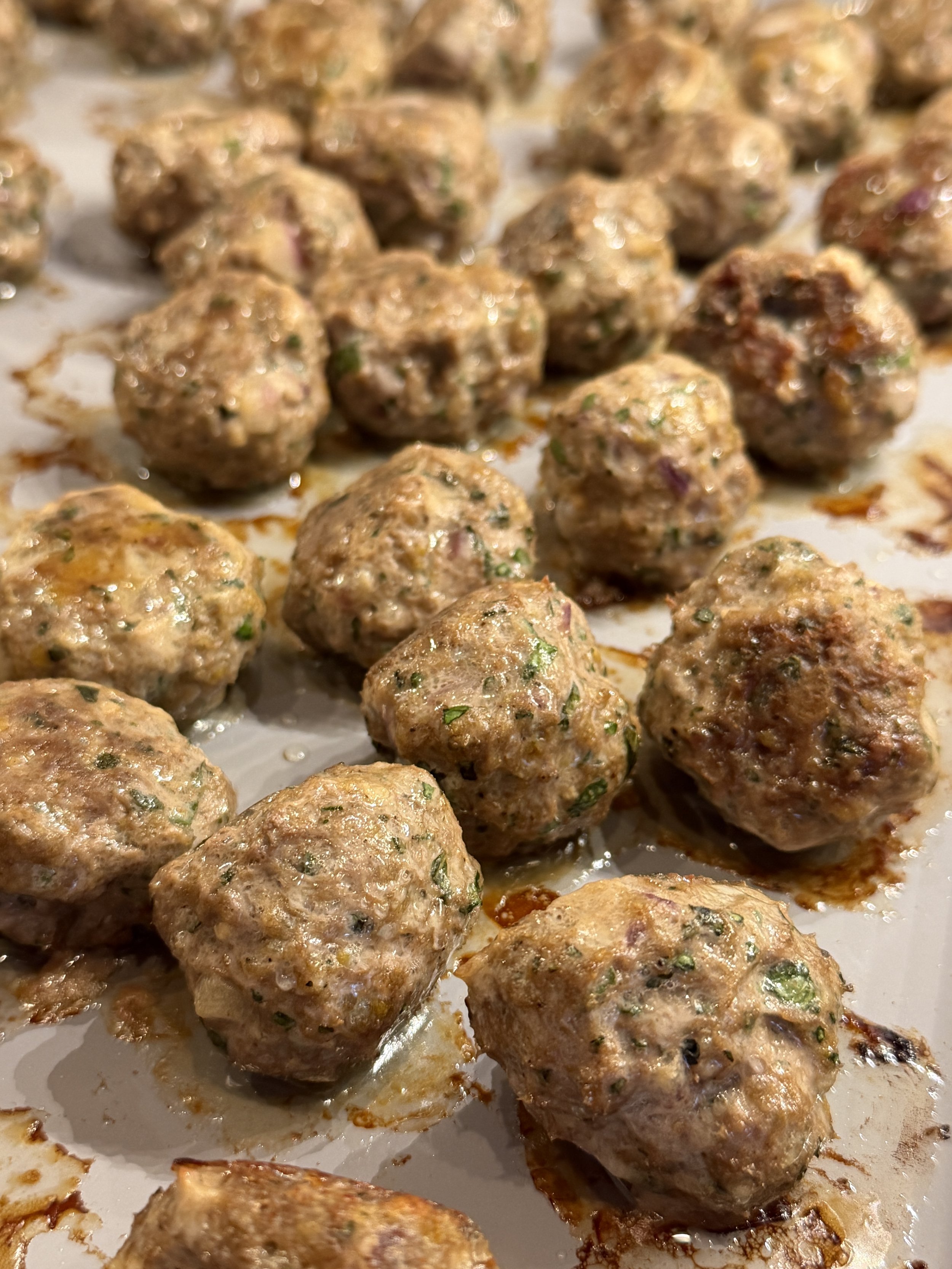 If baking, place the meatballs on a parchment-lined baking sheet with a bit of space between each one and bake for 18-20 minutes, flipping them halfway through, until they’re browned and cooked through to an internal temperature of 160°F.